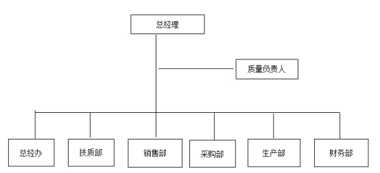 本公司确立以总经理负责的质量管理组织,由技质部全面负责公司的产品质量。由总经理授权,由叶忠柱经理担任质量负责人,总体负责策划、实施、评审和改进质量诚信管理工作,向高管理者报告质量诚信管理工作实施效果和改进要求,提高企业内部履行质量承诺意识。公司下设五个部门、车间及相关仓库。其中涉及质量管理的部门有技质部、采购部、生产部以及下属工艺车间及仓库。